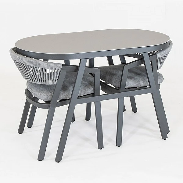 - Set comprises: 2 x dining chairs, 2 x cushion pads, 1 x compact oval table